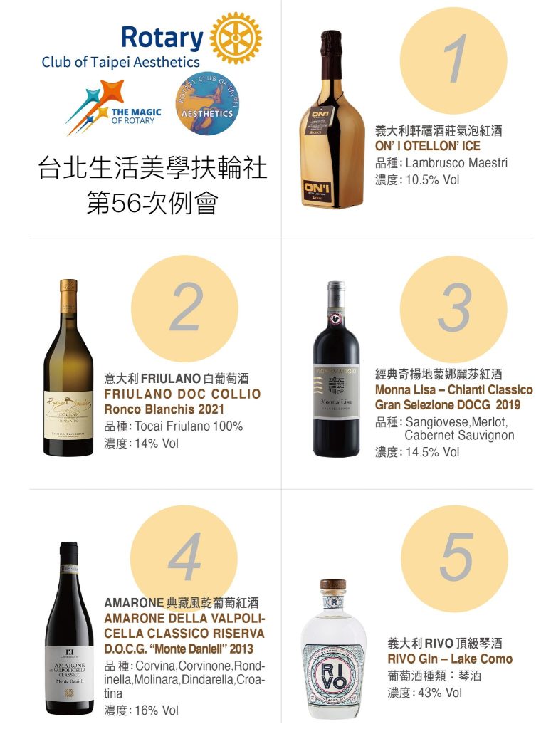 【台北生活美學扶輪社•第56次例會】——當酒神來的時候 Post author:FeverMax Post published:16 5 月, 2025 Post category:MY BLOG 【台北生活美學扶輪社•第56次例會】誠摯感謝台北生活美學扶輪社的邀約,由我們藏憶酒窖策劃第56次例會主題活動——「當酒神來的時候」。這是一場融合義大利文化包含著藝術、設計、電影、品酒、美食與義大利民謠歌劇與電子音樂的感官盛宴,於百年巴洛克老宅中盛大展開。當晚賓客盛裝雲集,在酒光杯影間,DJ音樂悠悠流轉,義大利精選葡萄酒的風韻在空氣中緩緩綻放。整場活動猶如一場跨越時空的魔幻旅程,東方靜謐與西方奔放交錯交融,宛如走入夢境與現實交界的曖昧邊界——那是一場獻給靈魂與感官的慢舞,也是一場對生活美學的深情致敬 開車不喝酒,喝酒不開車 飲酒過量有礙健康 未18禁止飲酒 Tags: Akacafe, Amarone Riserva, CECI, Chianti, COLLIO, DJ, DOCG, electronica, Friulano, gin, Italia, italy, Lambrusco, Monna Lisa, RIVO, Rotary, Sangiovese, Sparkling Red Wine, VIGNAMAGGIO Read more articles Previous Post義大利最棒的琴酒 You Might Also Like 我們與基隆地標『嶼我』wine pairing 22 2 月, 2024 27威爾第歌劇氣泡酒系列品酒會,大獲現場嘉賓好評,成功 24 8 月, 2022 義大利最棒的琴酒 20 11 月, 2024